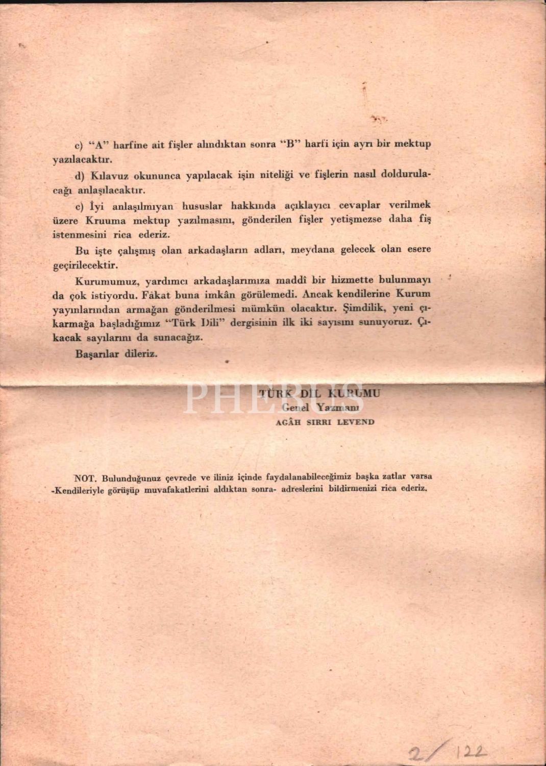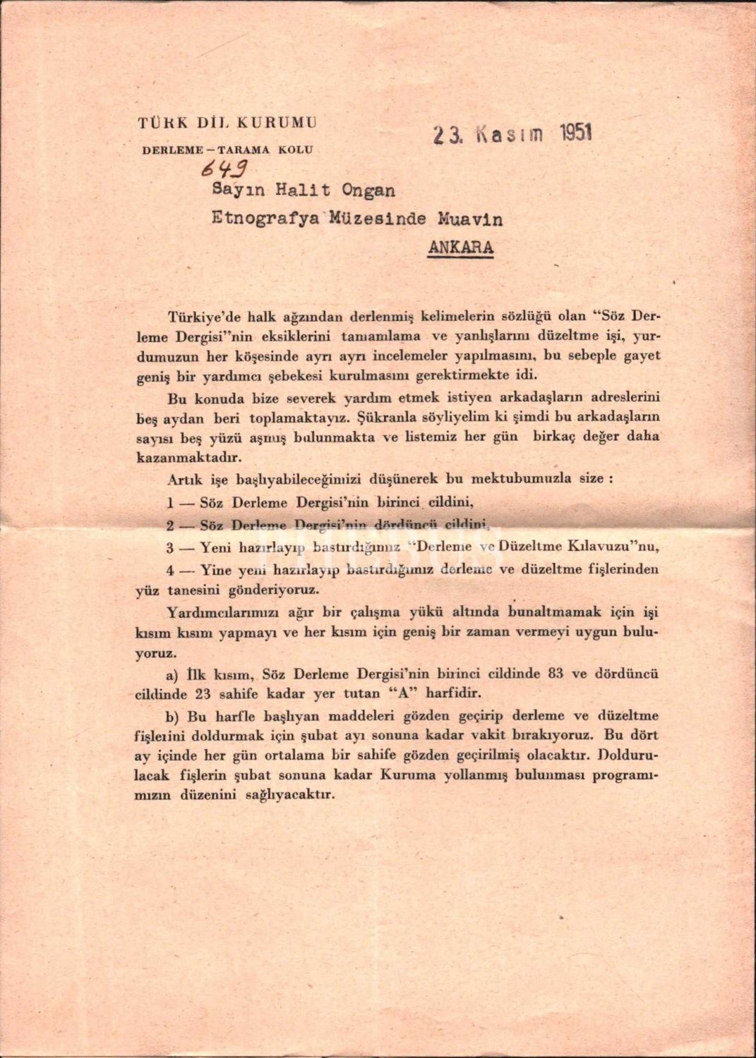 TDK Genel Yazmanı Agâh Sırrı Levend´den Etnografya Müzesi muavini Halit Ongan´a gönderilen 23 Kasım 1951 tarihli evrak, 24x35 cm