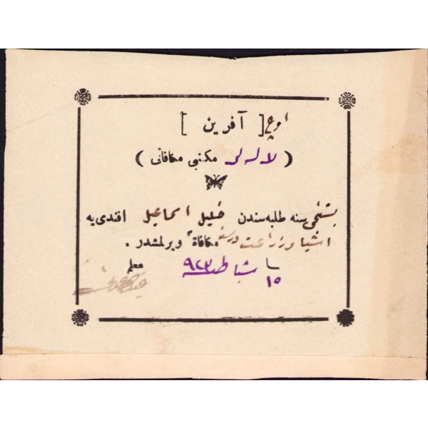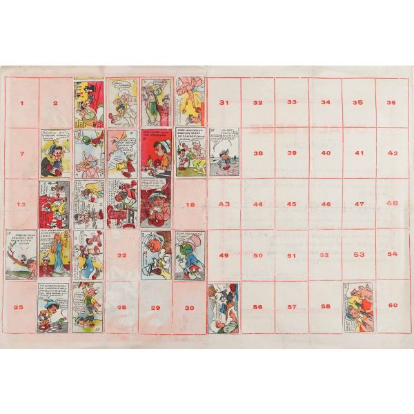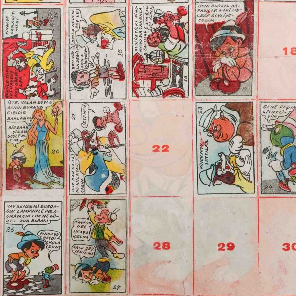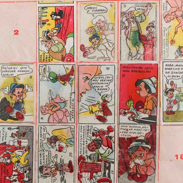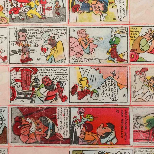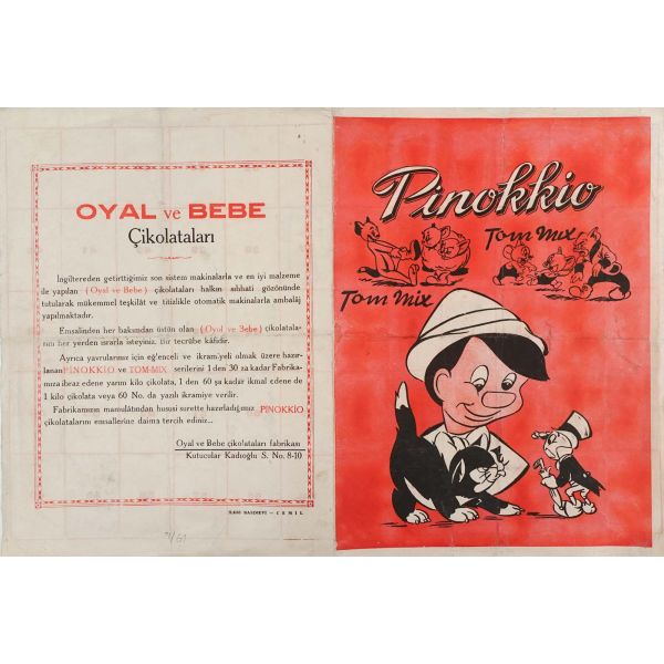 Arka kapağındaki yazı: "Oyal ve Bebe Çikolataları - İngiltereden getirttiğimiz son sistem makinalarla ve en iyi malzeme ile yapılan (Oyal ve Bebe) çikolataları halkın sıhhati gözönünde tutularak mükemmel teşkilât ve titizlikle otomatik makinalarla ambalâj yapılmaktadır. Emsalinden her bakımdan üstün olan (Oyol ve Bebe) çikolatalarını her yerden ısrarla isteyiniz. Bir tecrübe kâfidir. Ayrıca yavrularımız için eğlenceli ve ikramiyeli olmak üzere hazırlanan Pinokkio ve Tom-Mix serilerini 1´den 30´a kadar Fabrikamıza ibraz edene yarım kilo çikolata, 1´den 60´a kadar ikmal edene de 1 kilo çikolata veya 60 No.´da yazılı ikramiye verilir. Fabrikamızın mamulâtından hususi surette hazırladığımız Pinokkio çikolatalarını emsallerine daima tercih ediniz..."
