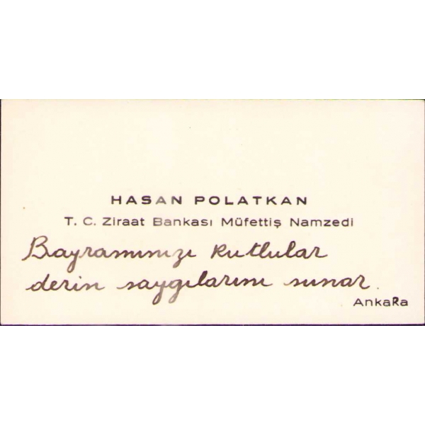 1950 - 1960 yılları arasında Demokrat Parti Hükümetinde Maliye Bakanı olarak görev yapan ve 27 Mayıs Darbesi'yle görevine son verilerek 1961 yılında idam edilen Hasan Polatkan'ın, henüz genç bir müfettiş adayı olduğu 1930'lu yıllardaki kartviziti…