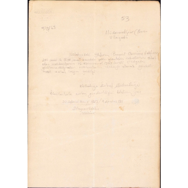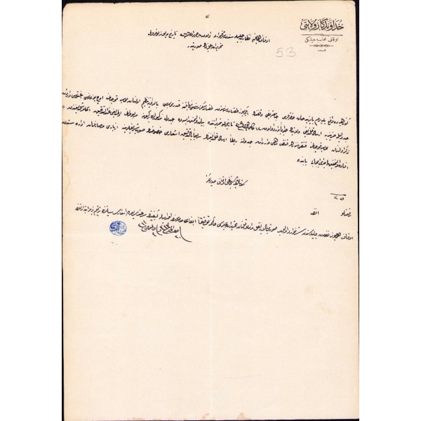 Harbiye Nazırı Mahmud Şevket Paşa imzalı Ferik Hilmi Paşa'ya hitaben yazılmıştır. Harbiye Nezareti antetli Altıncı Redif Müfettişliği tayini ile alakalı olup Ali Fuat Cebesoy'un babası İsmail Fazıl Paşa'nın da ismi zikredilmektedir.