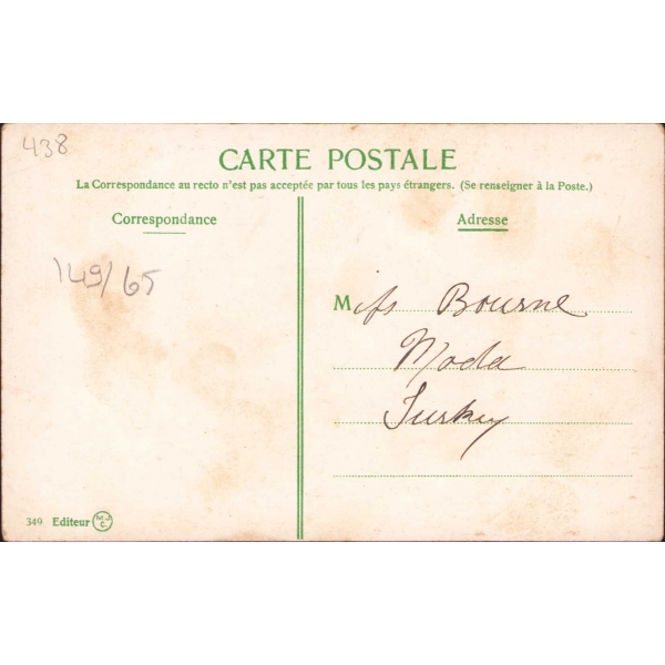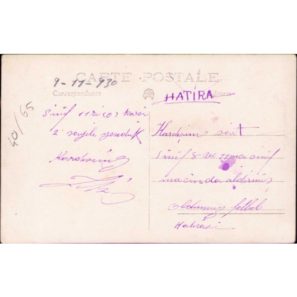 Fotokartın arkasında mektup bulunmaktadır. "Süleymaniye'de Saman veremi evvel mahallesinde dökmeciler hamamı ittisâlinde 19 nr. hânede miralay Mehmed Ali beyefendiye" şeklinde de not düşülmüştür.
