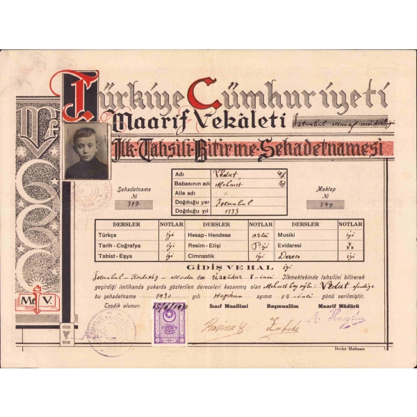 T.C. Maarif Vekilliği İlköğretim Diploması, İstanbul Kadıköy - Moda, 1930 tarihli, bir kenarı yırtık, 32x23 cm