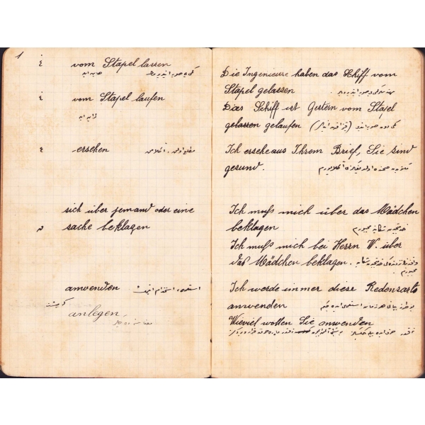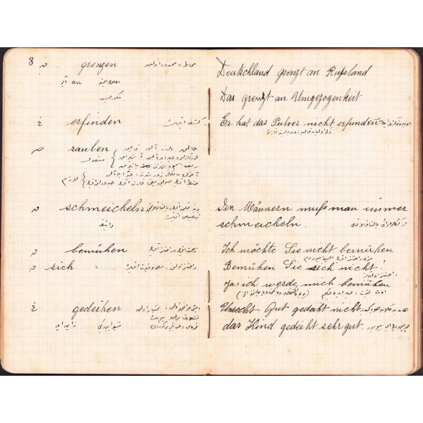 Almanca muhtelif notların buşunduğu defter, sırt ve kapak haliyle, 11x20 cm