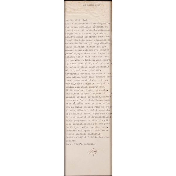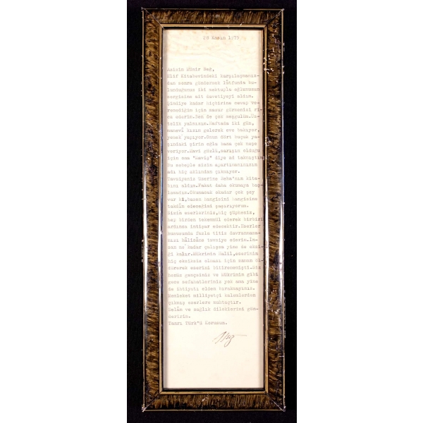 Türkçülük – Turancılık fikriyatı ve hareketinin, tartışmasız en önde gelen ismi olan Nihal Atsız'ın (1905 – 1975), "Münir" isimli bir tanıdığına yazdığı mektup… "… Tavsiyeniz üzerine Reha'nın kitabını aldım… Mükrimin Halil, eserinin hiç eksiksiz olması için zaman öldürerek eserini bitirememişti. Siz henüz gençsiniz ve Mükrimin gibi gece sefahatleriniz yok ama yine de..." Ahşap çerçeve içinde (Çerçeve boyutları: 13 X 36 cm)...