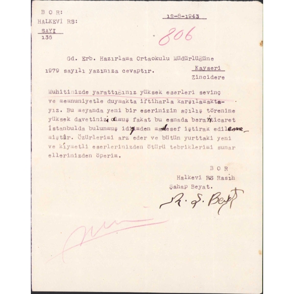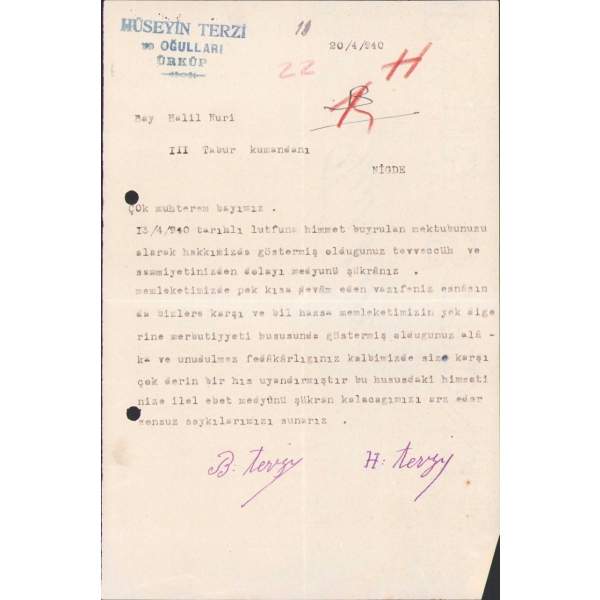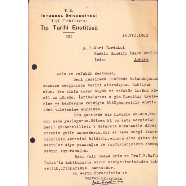 Mektuplar; İ.Ü. Tıp Tarihi Enstitüsü, Kayseri Dağcılık ve Kış Sporları Kulübü, Bor Halkevi, Hüseyin Terzi ve Oğulları-Ürküp antetli kâğıtlarda ve 1940-1960 tarihleri arasında kaleme alınmış olup zarflardan biri yıpranmıştır.