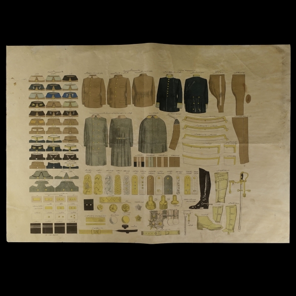 Üniformalar afişinde setre, ceket, pelerin, pantolon, ayakkabı, yaka, apolet, nişan ve madalyalar, kemer ve kılıç gibi bir subayın üniformasını oluşturan parçalar resmedilmiştir.