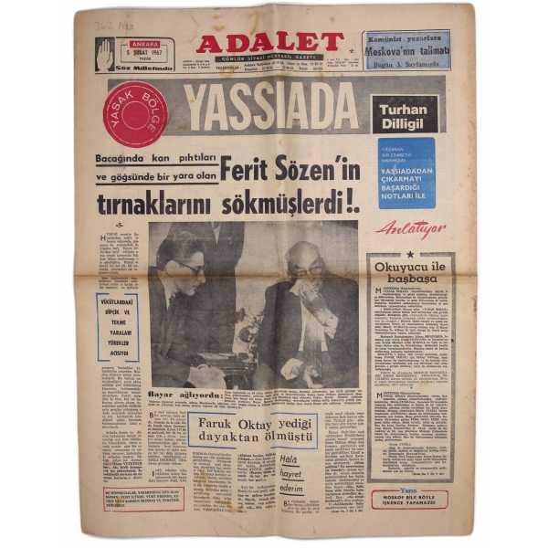 Adalet gazetesi, 5 Şubat 1967, "YASSIADA, Bacağında Kan Pıhtıları ve Göğsünde Bir Yara Olan Ferit Sözen'in Tırnaklarını Sökmüşlerdi!.", 8 sayfa, 43x60 cm