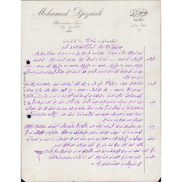 Osmanlıca, Fransızca Muhammed Cezairli, İskenderun antetli Osmanlıca doküman, 1927, 20x26 cm