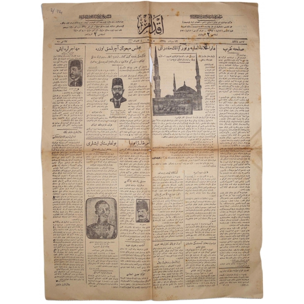 Osmanlıca İkdam Gazetesi, 31 Ağustos 1923 tarihli, Mustafa Kemal Atatürk'ün Meclis başkanlığına seçilmesi manşetli, 'Bütün Millet Meclisimizin Dünkü İctimaında Gazi Mustafa Kemal Paşa Hazretleri Meclis Riyasetine İntihab Edildi', 4 sayfa, 62x48,5 cm.