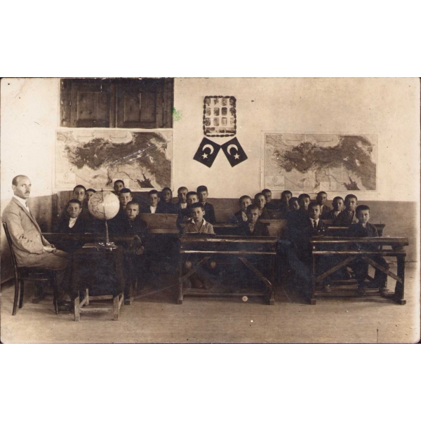 Ödemiş İlk Erkek Mektebi talebeleri baş muallimleri ile coğrafya dersinde, Osmanlıca Fotoğrafhane-i Ahmed Nevzad damgalı