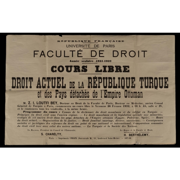 Tıp ve hukuk doktoru, Paris eski Başkonsolosu “M. Z. İ. Lütfi”nin, kursta ele aldığı konular arasında Türkiye´de İslam hukukunun ve halifeliğin gerilemesinin nedenleri, Osmanlı İmparatorluğu´nda İslam hukuku ve Osmanlı´dan kopan ülkelerde (Mısır, Filistin, Suriye) bu hukukun izleri, Türkiye Cumhuriyeti´nde uygulanmakta olan medeni hukukun ilkeleri vb. yer almaktadır.