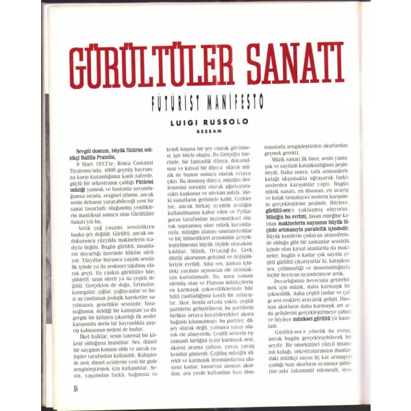 Musiki üstadlarından Bekir Sıtkı Sezgin'in genel yönetmenliğini yaptığı dergi; Türk sanat ve halk müziği, seçilmiş eserlerin notaları, bestecileri tanıtan biyografiler, Türk sanatları, sanat eleştirileri, dinî musiki, tasavvuf ve tiyatro gibi alanlardan oluşan geniş bir yazı yelpazesiyle 22 sayılık bir yayın hayatına sahip olmuştur.