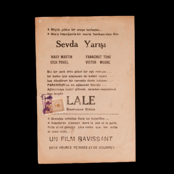 "4 Büyük yıldızı bir araya toplayan... 4 Neş´e kasırgasile bir san´at harikası olan film: Sevda Yarışı (Mary Martin - Franchot Tone - Dick Povel - Victor Moore) / Bin bir zevk dolu güzel bir aşk romanı... Bir kadın için ateşlenen iki kalbin isyanı... Baş döndüren bir servetin derin inkisarı... PARAMOUN´un en eğlenceli filmidir... Ağlayıncaya kadar gülmek, neşeden mestolmak için bugün LALE Sinemasına Gidiniz." *Damga Pullu.