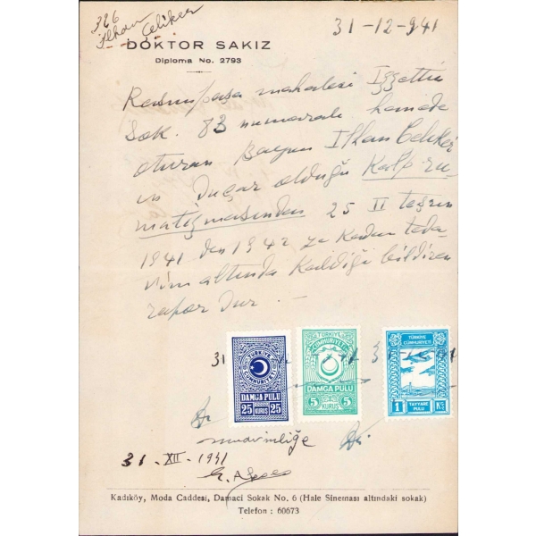 Doktor Sakız antetli, 1941 tarihli reçete, 14x19