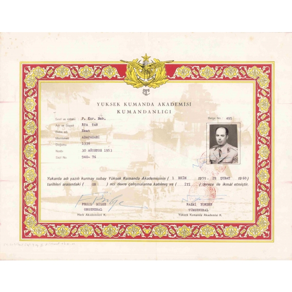 Yüksek Kumanda Akademisi Kumandanlığı diploması, 1953 tarihli, 38x30 cm