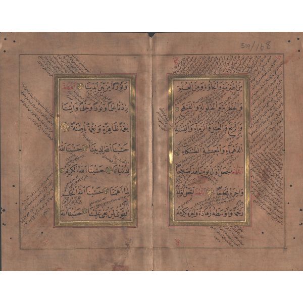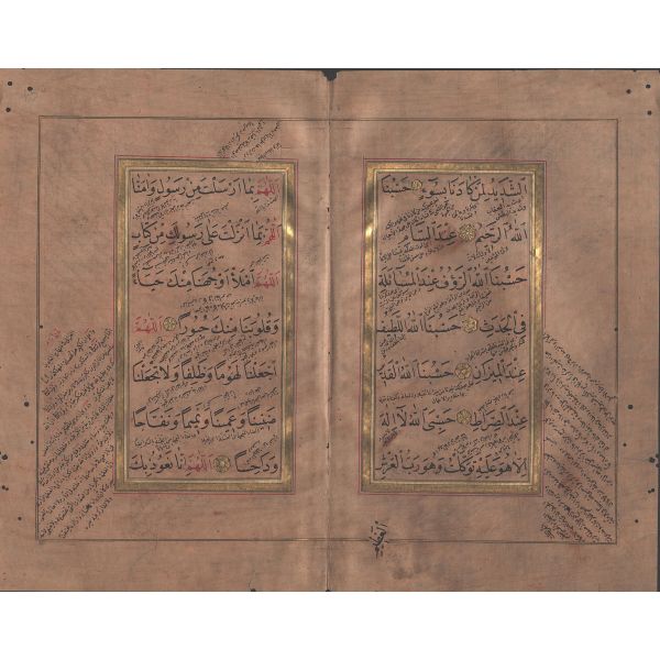 Kur´an-ı Kerim´in unvan sayfası tamamıyla altın kaplama ve floral desenlerle süslenerek tezhip edilmiştir. Sure başlarında bulunan serlevhalar ve sayfa kenarlarında bulunan cetveller altın tezhiplidir.