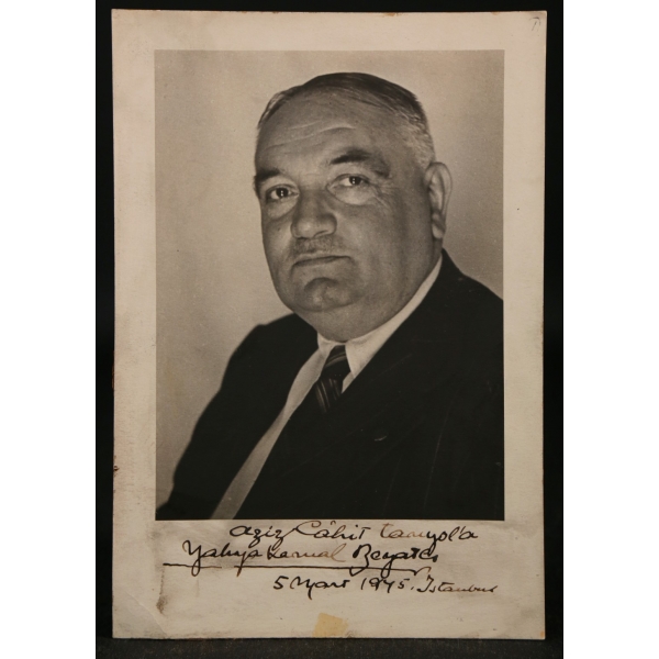 Sağlığında hiç kitap yayımlamamış olmasına karşın, dergi ve gazetelerde yayımladığı şiirleri ve yazılarıyla, yaşadığı dönemde Türk şiirinin ve nesrinin en büyük temsilcilerinden biri olarak kabul edilen, edebi çevrelerde hep “üstat” olarak anılan ve her çevreden saygı gören Yahya Kemal Beyatlı´nın, "Güzeli, iyiyi, gerçeği" aramak ülküsüyle çıkarılan "Aramak" adlı dergiyi çıkararak edebiyat dünyasında geniş yankı uyandıran Cahit Tanyol´a ithaflayarak imzaladığı orijinal fotoğrafı.