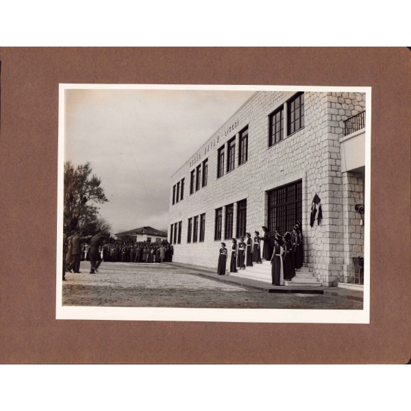 Fotoğrafın sol üst köşesine eski ve yeni harflerle "Selanik - 30 Temmuz 325, topçu endaht mektebi kışlası resmi küşadı" notu düşülmüştür. *Kartona yapışıktır.