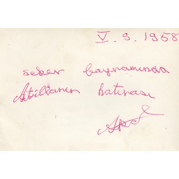 İthaf ve imza "28 Teşrinisani 1339 Sevgililerim Sare ve Şevket Bey'e Ali Fuad" şeklindedir. Şevket Mocan, Çiftçi ve Demokrat Parti Tekirdağ milletvekili, siyasetçi, Sare Hanım ise Nazım Hikmet'in teyzesidir.