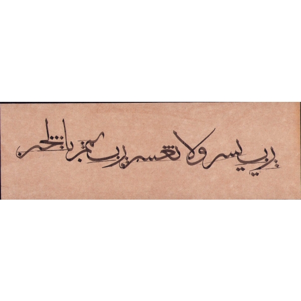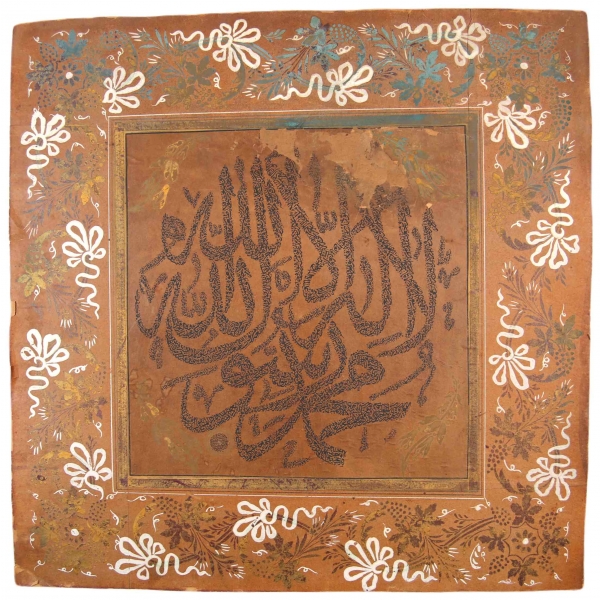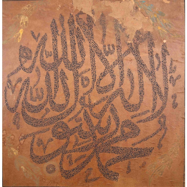 16. yy kitap tezyinatlarında kullanılan tarz ile, altın-lacivert tezhip içine beyaz mürekkeple yazılmış bir besmeledir. Eser Osmanlı dönemi bir eser değil, muhtemelen imzada yazan 84 (1984) tarihlidir.