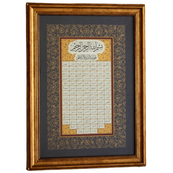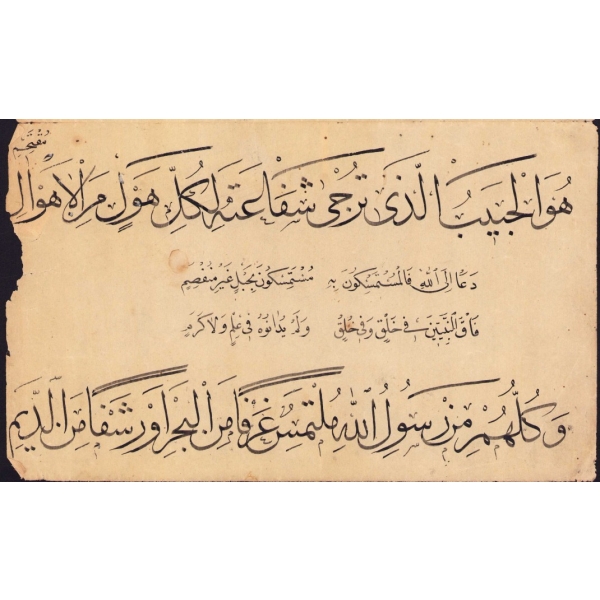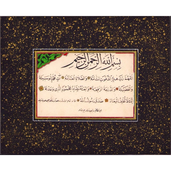 Sülüs Kısım Okunuşu: Allahu veliyyu´l hidayeti ve´t-tevfîk. Anlamı: Allah hidayetin ve başarının sahibidir. Nesih Kısım: Kim ezanı duyduğunda "Allahumme rabbe hâzihi....." duasını (ezan duasını) okursa kıyamet gününde şefaatim ona helal olur.