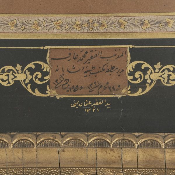 Üstte muhakkak besmele, altta nesih yazıyla yazılmış gövde metni, etrafında sülüs esma-i çehar yâr-i güzin yazılıdır. Besmelenin altındaki dairenin içinde ince sülüs yazı ile "Allah c.c. Muhammed s.a.v. Hasan r.a. Hüseyin r.a." isimleri yazılıdır. Mehmed Şevket Bey, hem besmelenin altına imza atmış hem de eserin sonuna ketebe kaydı düşmüştür.