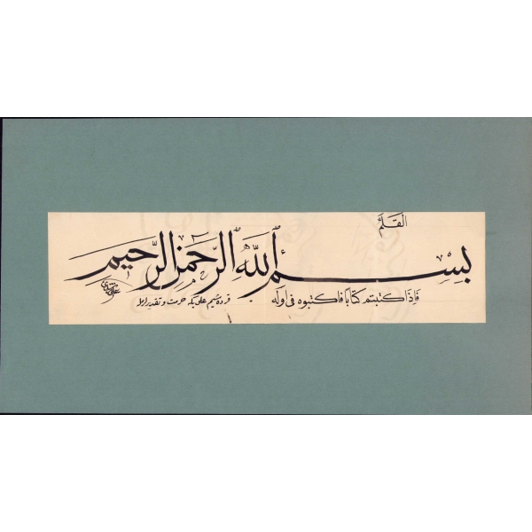 Okunuşu, "Cümle kulûb-ı yâran zevk-ı surûrla doldu / Çek bâ-i besmeleyle yaz Necmi tarihin / Hattat Hacı Halim Bey şanla muallim oldu" şeklindedir. Yazı üzerinde imza bulunmamaktadır ancak yazının Hattat Halim´e ait olduğu düşünülmektedir.