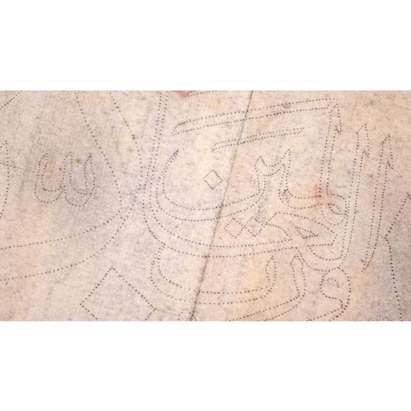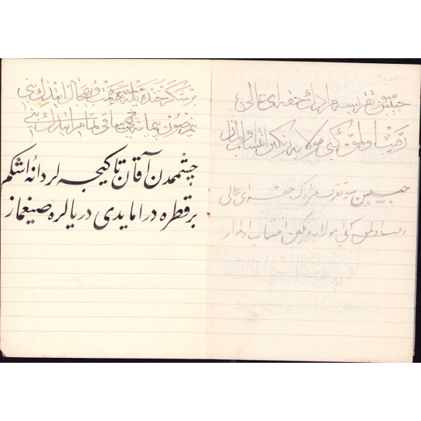 Okunuşu: "Ey Bâr-ı Hudâ be-hak-ı hestî; Şeş çîz merâ meded ferestî; İlm ü amel ü ferâh-destî; Îmân ü emân ü ten-dürüstî [Ey Cenâb-ı Allah, varlığn hakkı için; Şu altı şeyi yardımıma gönder; İlim, amel ve el açıklığı; İman, güvenlik ve beden sağlığı]" (Ebu Saîd Ebu´l-Hayr)