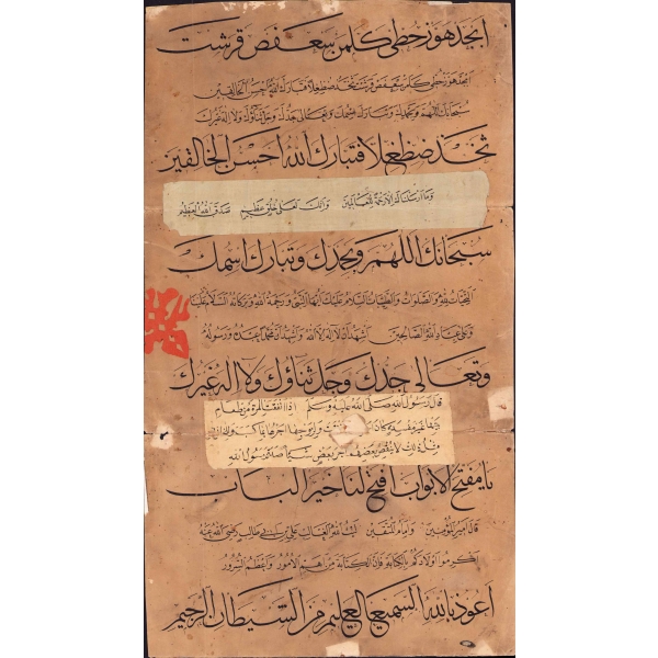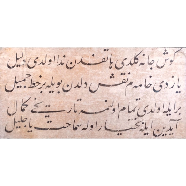 nesih metnin okunuşu: "Ekrimû evlâdeküm bi´l-kitâbe fe-inne´l-kitâbeti min ehemmi´l-umûri ve a´zami´s-sürûr [Çocuklarınıza yazı yazmayı öğretin, zira yazı yazmak en önemli işlerden ve en büyük sevinçlerdendir]";