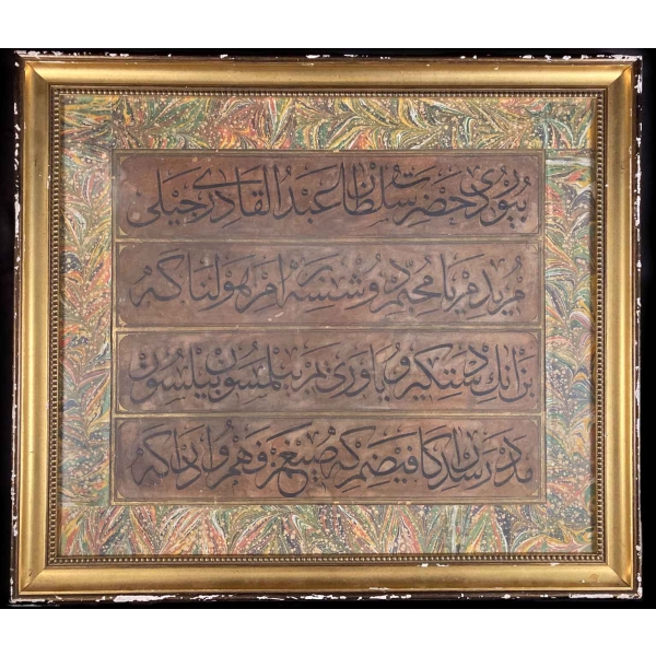Yazının sülüs bölümü Şeyh Hamdullah’a ait olup ketebesi mahiyetindeki bir metinden alınarak bu kıtaya eklendiği anlaşılmaktadır.