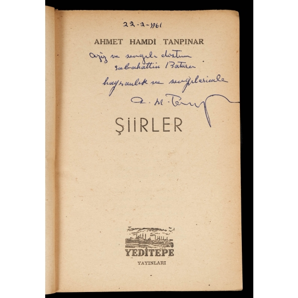Huzur, Saatleri Ayarlama Enstitüsü, Abdullah Efendinin Rüyaları, Beş Şehir gibi; roman, hikâye, deneme ve edebiyat tarihi alanlarında aşılması güç eserler vermiş, büyük bir edebiyatçı ve aydın olan Ahmet Hamdi Tanpınar´ın şiirleri... "Aziz ve sevgili dostum Sabahattin Batura hayranlık ve sevgilerimle." ithafıyla imzalıdır.
