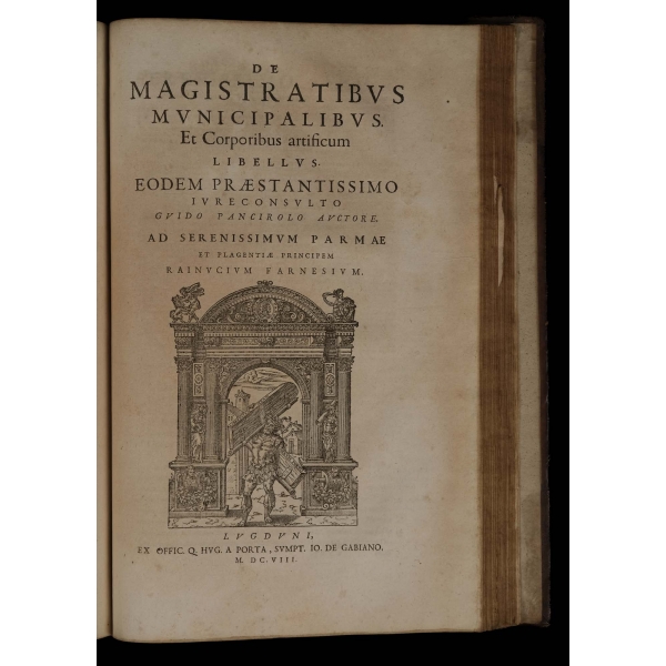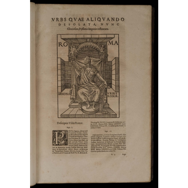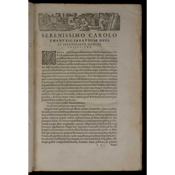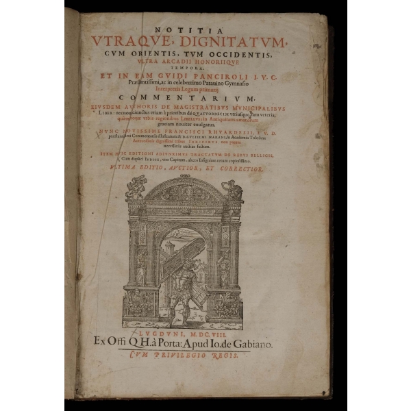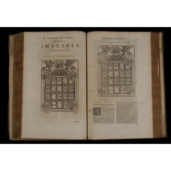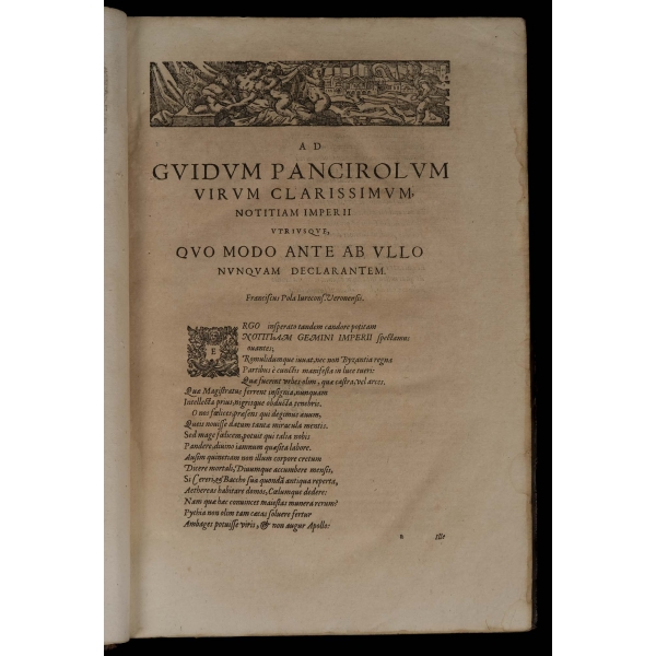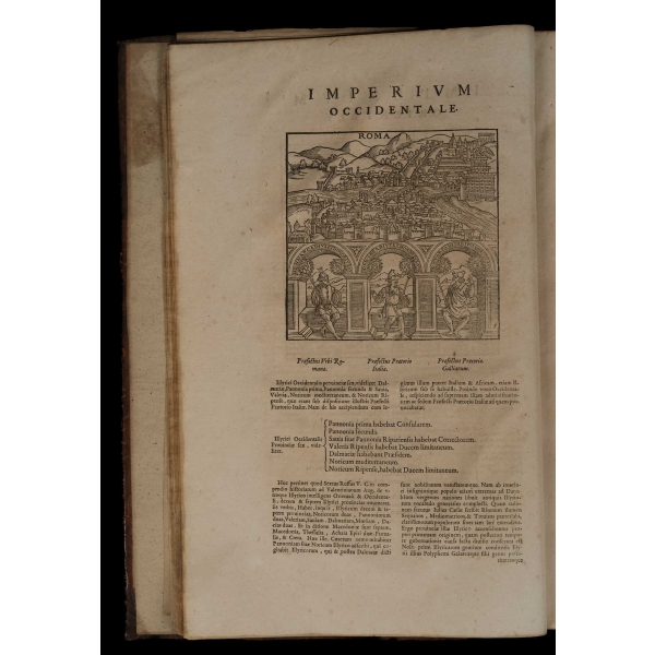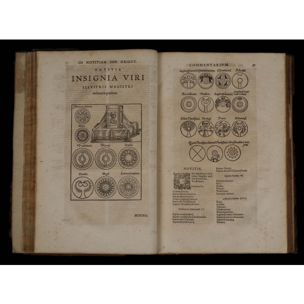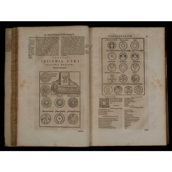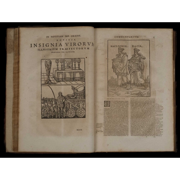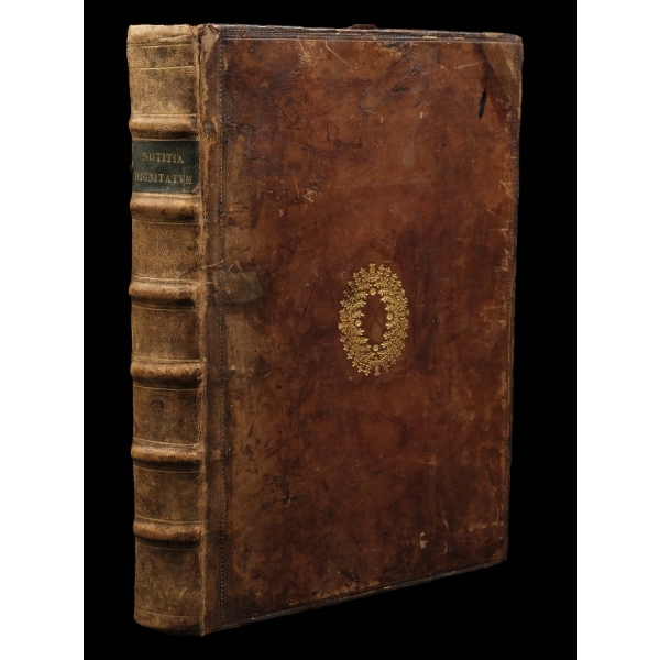 Roma imparatorluğu´nun idari yapısı hakkında emsalsiz bir veri kaynağı olan resmî imparatorluk dokümanı "Notitia dignitatum"un 1608 tarihli, çok sayıda tablo, şekil ve illüstrasyon içeren nadide bir baskısı... Doğu ve Batı Roma imparatorluklarının askeri ve idari yapılanmalarının titizce mercek altına alındığı kitapta ayrıca Roma´nın on dört bölgesi ve yapılarına (kamu ve özel) dair bir ek mevcuttur.