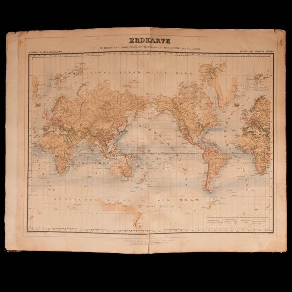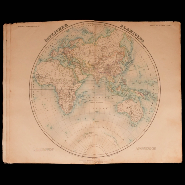 Kiepert tarafından hazırlanan "Dünyanın her yerini gösteren yeni el tipi atlas"ın, tamamen düzeltilmiş ve genişletilmiş ikinci baskısı. Günümüze eksiksiz ulaşan atlas içerisinde 45 adet harita yer almaktadır. Kenarları deri kaplamalı tümüyle bez dönem cildinde. Kapak köşelerinde pirinç koruma başlıkları mevcuttur (arka kapağın alt köşesindeki eksik). İç kapakları ebrulu. *Deri sırtı kopmuş, geriye bez kaplama kalmıştır.