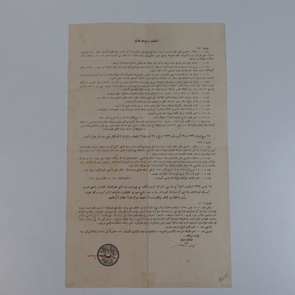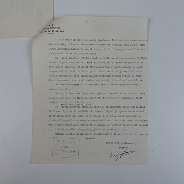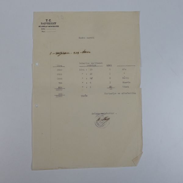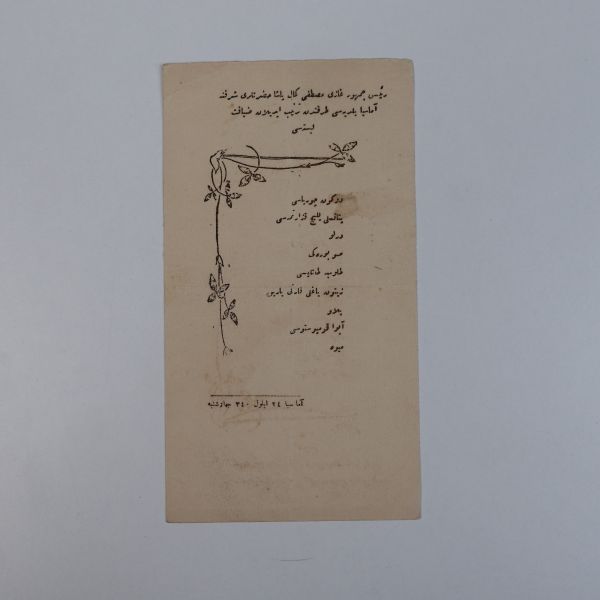 "Reis-i Cumhur Gazi Mustafa Kemal Paşa Hazretleri şerefine Amasya Belediyesi tarafından tertip edilen ziyafet listesi" başlıklı menünün içeriği: Düğün çorbası, yataklı piliç kızartması, türlü, su böreği, tulumba tatlısı, zeytinyağlı karnıyarık, pilav, ayva kompostosu, meyve.