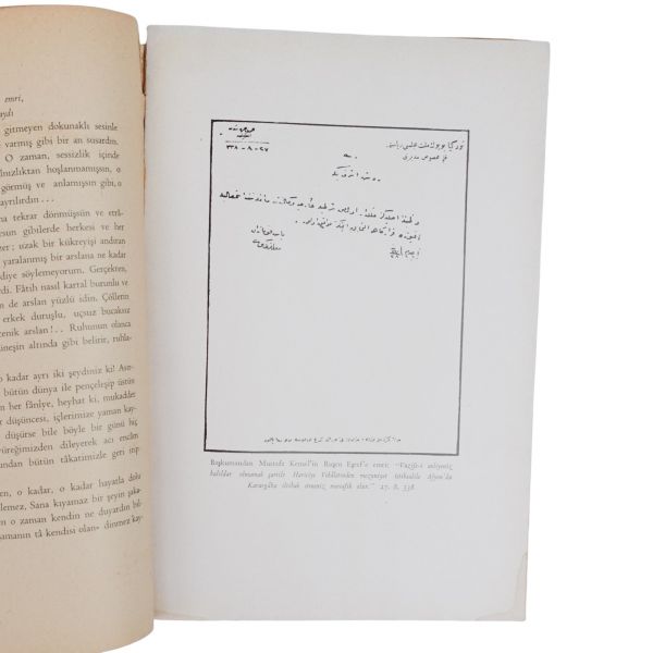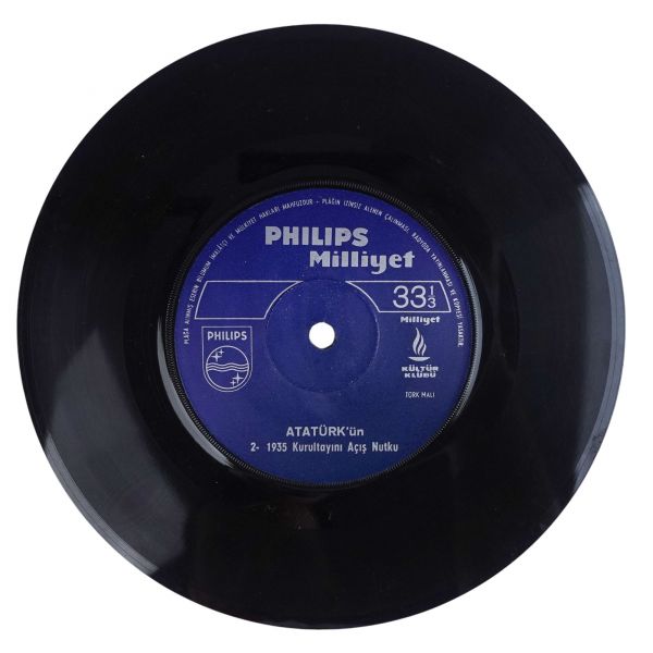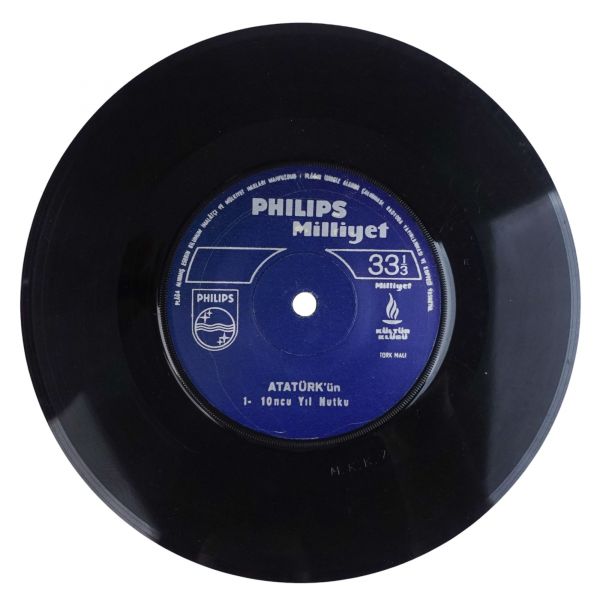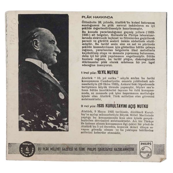 "Plâk hakkında: Ölümünün 28. yılında, Atatürk´ün kutsal hatırasına sunduğumuz bu plâk mevcut imkânların en iyi şekilde değerlendirilmesiyle hazırlanmıştır. Bu konuda yararlandığımız geçmiş yıllara (1933-1935) ait belgeler, Hollanda´da Philips laboratuarlarında elektronik teçhizat ve filtrelerden geçirilerek parazit ve gürültü sesleri imkân nisbetinde süzülmüştür. Bu tarihî sesin size en net ve pürüzsüz şekilde kazandırılması için gösterilen bütün çabaya rağmen, yararlanılan belgelerin ilkel metodlarla kaydedilmiş oluşu ve zamanla yıpranmış bulunması, daha iyi bir plâk yapılmasını engellemiştir. Bütün bunlara rağmen, bu tarihî plâğın, diskoteğinizde dökümanter plâk olarak müstesna bir yer işgal edeceğine inanıyoruz."