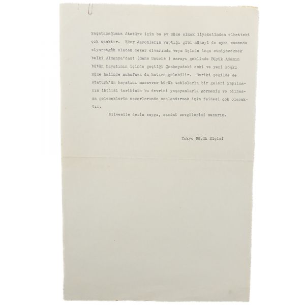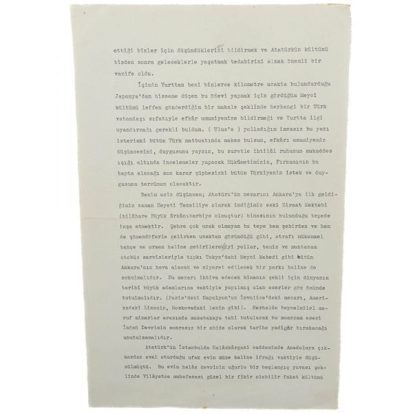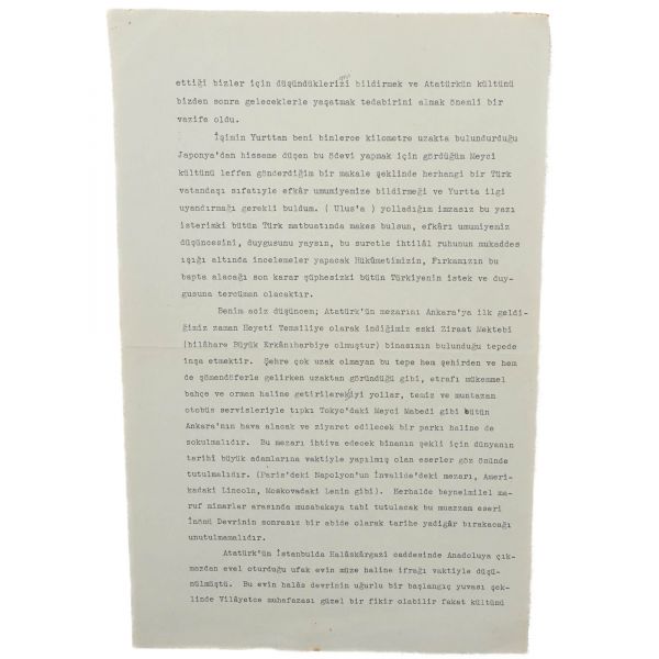 Hüsrev Gerede´nin üç sayfalık mektubu, şu ifadeleri içermektedir: "Benim aciz düşüncem; Atatürk´ün mezarını Ankara´ya ilk geldiğimiz zaman Heyeti Temsiliye olarak indiğimiz eski Ziraat Mektebi (bilâhare Büyük Erkânıharbiye olmuştur) binasının bulunduğu tepede inşa etmektir. Şehre çok uzak olmayan bu tepe hem şehirden ve hem de şömendöferle gelirken uzaktan göründüğü gibi, etrafı mükemmel bahçe ve orman haline getirilerek iyi yollar, temiz ve muntazam otobüs servisleriyle tıpkı Tokyo´daki Meyci Mabedi gibi bütün Ankara´nın hava alacak ve ziyaret edilecek bir parkı haline de sokulmalıdır. Bu mezarı ihtiva edecek binanın şekli için dünyanın tarihî büyük adamlarına vaktiyle yapılmış olan eserler göz önünde tutulmalıdır. (Paris´teki Napolyon´un İnvali´dedeki mezarı, Amerikadaki Lincoln, Moskovadaki Lenin gibi). Herhalde beynelmilel maruf mimarlar arasında musabakaya tabi tutulacak bu muazzam eseri İnönü Devrinin sonrasız bir abide olarak tarihe yadigâr bırakacağı unutulmamalıdır." *Refik Saydam´ın cevap mektubunda yıpranmalar mevcuttur.