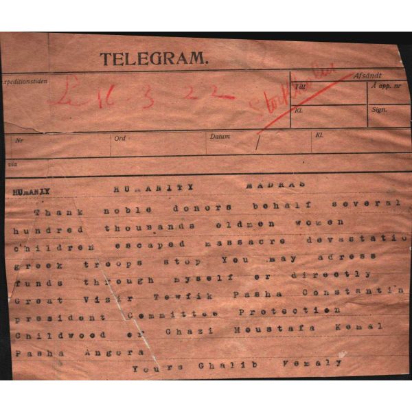 16 Mart 1922 Stockholm ‘dan gönderilmiştir. Yunan Askerlerinin pek çok Türk, yaşlı, kadın ve çocukları katlettiğini Tevfik Paşa ve Gazi Mustafa Kemal Paşa’ya acilen iletmelerini bildiriyor.