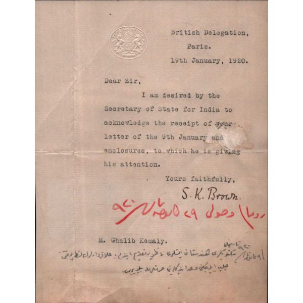 9 Ocak 1920 tarihli mektubu İngiltere’nin Hindistan İşleri Bakanına vermesinin ardından bakanın yapılan şikayetlerle yakından ilgileneceğine dair mektubu.