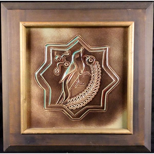 "Çanakkale Seramik fabrikaları sanat atölyesinde seramik sanatçısı Mustafa Tunçalp tarafından Prof. Dr. Rüçhan Arık başkanlığında Anadolu Selçuk dönemi 13. yüzyıl sonu Kubad Abad sarayı 2002 kazılarından çıkarılan çinilerden esinlenerek çalışılmıştır. 2003-ÇAN"