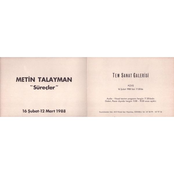 Metin Talayman, süreçler başlığı altında topladığı resimleri kent yaşamının çelişkili ve boğucu açmazları içinde bunalmış olan günümüz insanının dramını, anlatımcı bir resim dili ile dışa vurur.