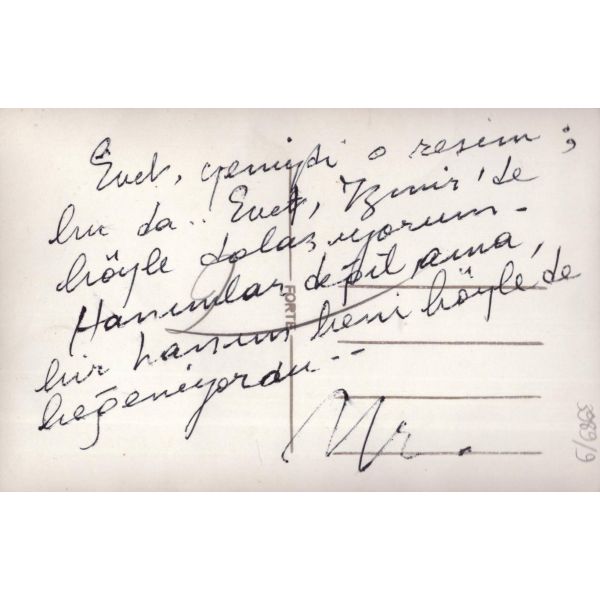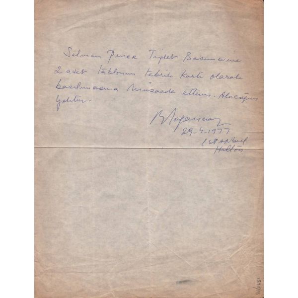 "Selman Pınar Tuğrul (?) Basımevine 2 adet tablomun tebrik kartı olarak basılmasına müsaade ettim. Alacağım yoktur"