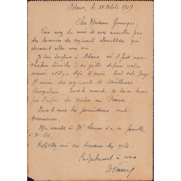 "...Ben hala Adana'dayım. Müthiş sıcak var, Senegalli askerler gelmeye devam ediyor, herkes Fransa'ya dönemk istiyor..."