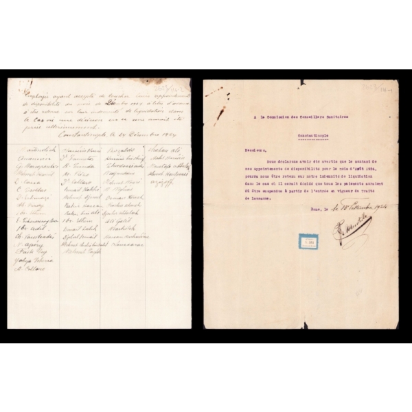 Roma'dan İstanbul'daki Sağlık Danışmanları Komitesine gönderilmiş. Lozan Antlaşması'nın yürürlüğe girmesinden itibaren tüm ödemelerin askıya alınmasına karar verilmesi halinde Ağustos ayına ait bekleyen ödemelerin tasfiye edilecek tazminattan kesilebileceği konusunda bir bilgilendirme beyanatı...