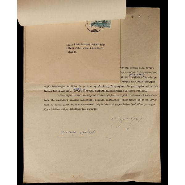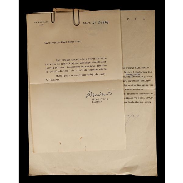 Ahmet Cevap Eren´in mektubu: "Çok Sayın Baş Bakanımız, Tarih yazmak için tarih yapmak lâzımdır. Celâdet ve cesaret´ten yoksun olan devlet idareleri, refah içinde dahi olsalar, o milleti yaşatan ebedi devlet fikrinden bir gün mahrum kalırlar. Yarım yüz yılı aşan Türkiye Cumhuriyeti Devleti, Yavru Vatan Kıbrıs´ta giriştiği barış harekâtı ile yalnız üç bin beş yüz yıllık Türk devlet hayatının tarihine değil insanlığın tarihine de yeni ve ışıklı bir yol açmıştır. Bu yeni aydın yolun başlaması Zat-ı Âlinizin Hukümet yönetimi başında bulunduğunuz döneme rasladı. Cumhuriyet tarihi bu başarılı devri şüphesizki şanlı ordumuzun kahramanlıkları ile sayfaları arasına alacaktır. Sevgili vatanımıza, Milletimize ve ebedi Devletimize bu mutlu günlerin hazırlanmasında büyük hizmeti geçen Zat-ı Devletlerine saygı ile gönülden gelen tebriklerimi sunarım." Bülent Ecevit´in cevabı: "Türk Silâhlı Kuvvetlerinin Kıbrıs´ta barış, kardeşlik ve özgürlük uğruna yürüttüğü harekât dolayısıyle belirtmek inceliğinde bulunduğunuz görüşlerle iyi dilekleriniz için içtenlikle teşekkür ederim. Mutluluklar ve esenlikler dileğiyle saygılar sunarım."