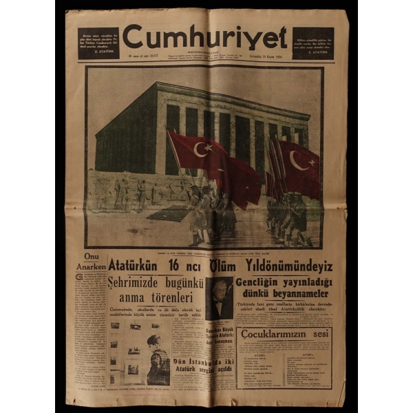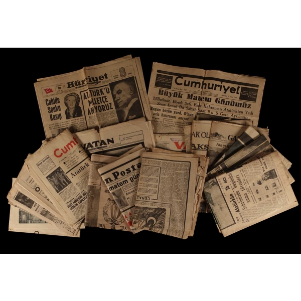 Lot içeriği: Cumhuriyet (1941, 1945, 1947 [İki adet], 1954, 1955, 1964 ve 1966 [2 adet] tarihli dokuz nüsha) - Vatan (1940, 1952 [İki adet], 1953, 1954 [İki adet], 1955 ve 1956 [İlaveli] tarihli sekiz nüsha) - Hürriyet (1948, 1949, 1953 [İki adet], 1955 ve 1966 tarihli altı nüsha) - Dünya (1955 tarihli bir nüsha) - Yeni Sabah (1940, 1954 ve 1955 tarihli üç nüsha) - Yeni İstanbul (1954 tarihli bir nüsha) - Son Posta (1946 ve 1947 [İki adet] tarihli üç nüsha) - Tasviri Efkâr (1940 tarihli bir nüsha) - Milliyet (1966 tarihli bir nüsha) - Tasvir (1948 tarihli bir nüsha) - Akşam (1964 [İlaveli] ve 1966 tarihli iki nüsha) - Yeni Gazete (1966 tarihli bir nüsha) / Tekrarlı tarihler ekseriyetle 10-11 Kasım tarihlidir.