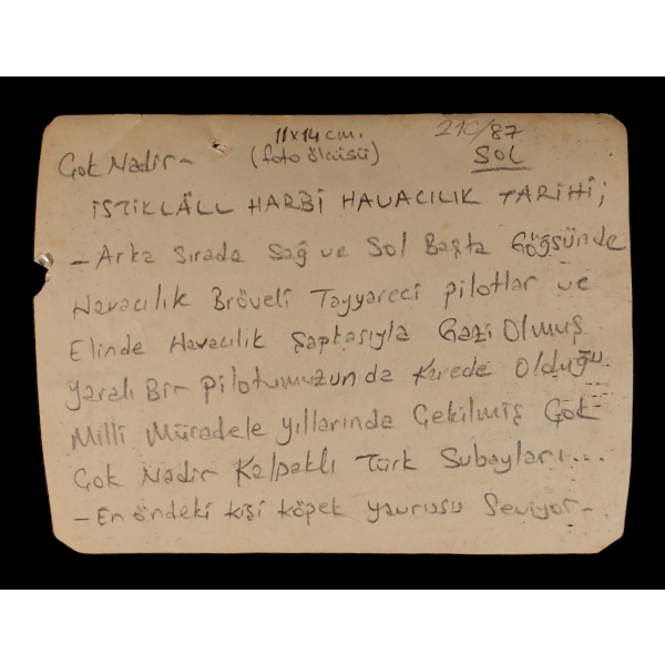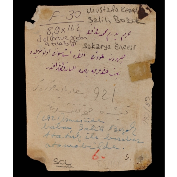 Fotoğrafın arka yüzünde Osmanlıca, "Muhterem pederim Mehmed Beyefendi cepheden avdetten Ankara İstasyonu´nda otomobilde Paşa Hazretleri ile birlikte alınan fotoğrafıdır." notu yer almaktadır.
