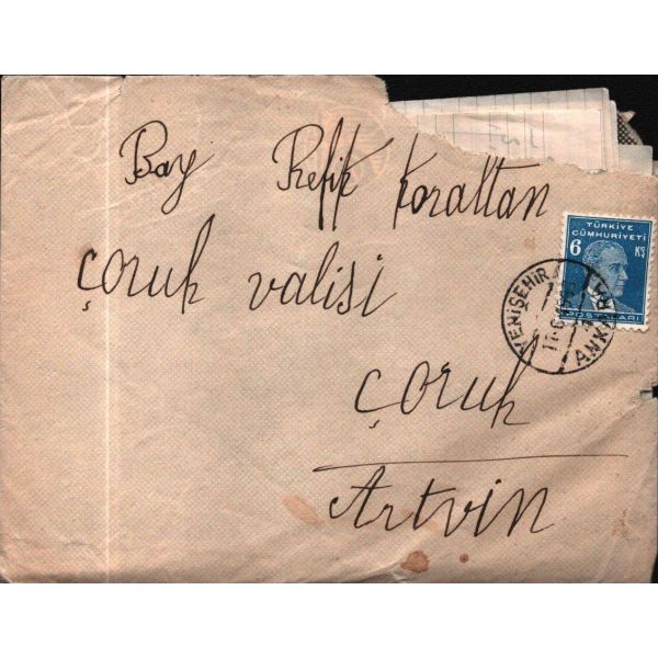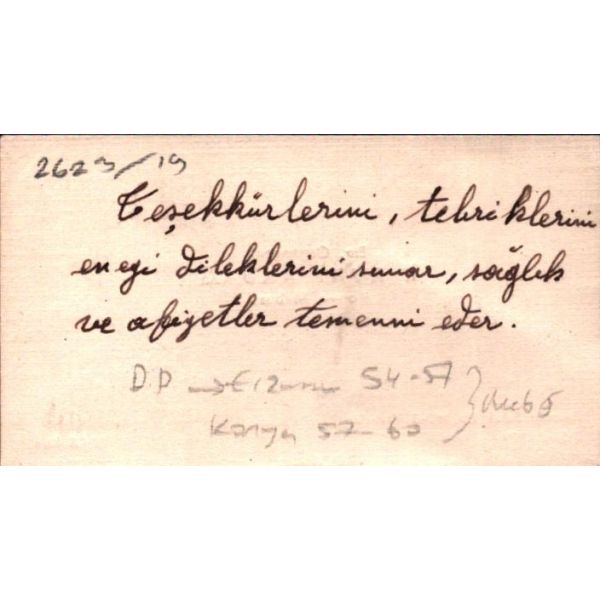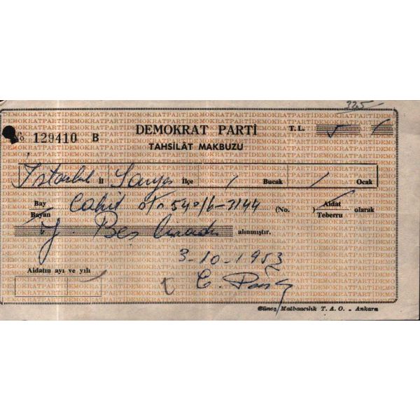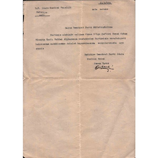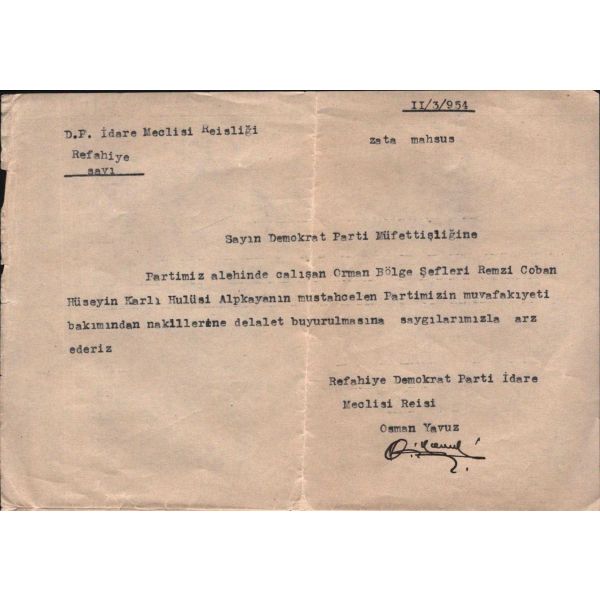 "11/3/954 Sayın Demokrat Parti Müfettişliğine - Partimiz alehinde çalışan Orman Bölge Şefleri Remzi Çoban Hüseyin Karlı Hulüsi Alpkayanın mustahcelen Partimizin muvafakıyeti bakımından nakillerine delalet buyurulmasına saygılarımızla arz ederiz Refahiye Demokrat Parti İdare Meclisi Reisi Osman Yavuz"
