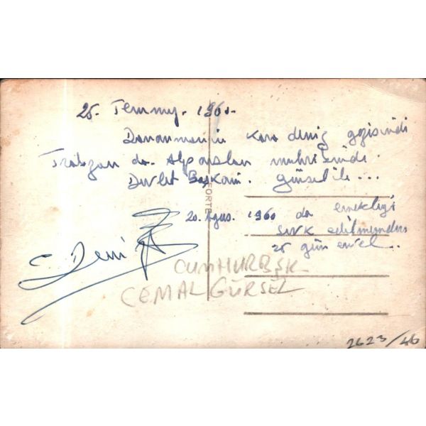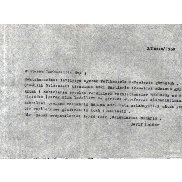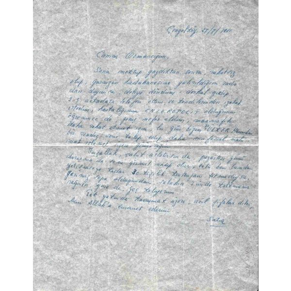 "27/7/1961 Canım Osmancığım, Sana mektup yazdıktan sonra, rahatsız olup, garnizon hastahanesine yatırıldığını [?] olan duyunca, deliye döndüm, derhal gidip, 2-3 arkadaşa telefon ettim, ve kendilerinden izahat istedim, hastalığının ENTEREPOLIT olduğunu öğrenince de, geniş nefes aldım, maamafih daha rahat etmek için, bu gün bizim Dr. ÜLKER Hanımdan bir randevu talep edip, daha mufassal malûmat istemek üzere görüşeceğim..."