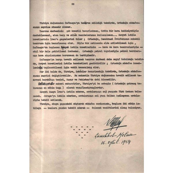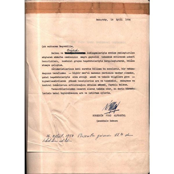 "Bakırköy 16 Eylül 1954, Çok muhterem Başvekilim, Balkan ve Bağdad Andlaşmalariyle evcine yaklaştırılan müşterek müdafaa camiasının meşru gayesini tahakkuk ettirecek askeri hazırlıkları, komünist grupun teşebbüsleriyle karşılaştırarak, hülâsa etmeye çalıştım. Zâtidevletlerince kati surette bilinen bu esasların, bir vatandaşınız tarafından -- hiçbir mes´ul makamın yardımına mazhar olmadan, şahsi teşebbüsleriyle elde ettiği adedi ve teknik bilgilere göre -- kıymetlendirilerek yüksek tensiplerine arz ve takdimini, mukayese ve kontrol imkânlarını arttıracağını mütalaa ederek, faydalı buldum. Teveccühlerinizden cesaret alarak takdim eder, en derin hürmetlerimin kabul buyurulmasını arz ve istirham eylerim. Nureddin Fuad Alpkartal - Çanakkale Mebusu (16 Eylûl 1954 Perşembe günü 11.30 da takdim edildi.)"