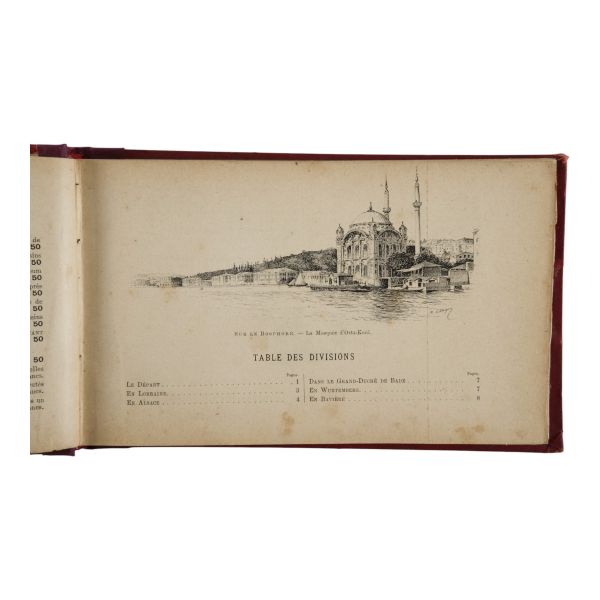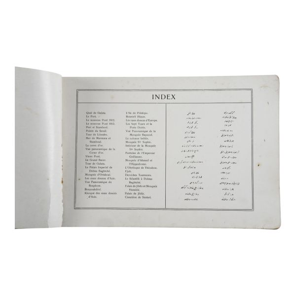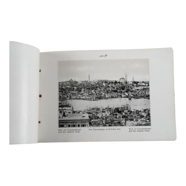 Albüm içinde yer alan manzaralar: 1) Galata Rıhtımı 2) Karaköy Limanı 3) Yeni Galata Köprüsü (Karaköy´den bakış) 4) Yeni Galata Köprüsü (Eminönü´nden bakış) 5) Yeni Galata Köprüsü ve Haliç 6) Sarayburnu 7) Kız Kulesi 8) Ahırkapı Feneri ve Suriçi 9) Haliç ve tersaneler 10) Haliç´e panoramik bakış 11) Unkapanı Köprüsü ve Haliç 12) Kapalıçarşı 13) Galata Kulesi 14) Dolmabahçe Sarayı 15) Ortaköy Camii 16) Göksu Deresi ve Anadolu Hisarı 17) Boğaziçi´ne panoramik bakış 18) Büyükdere Sahili 19) Küçüksu Kasrı 20) Büyükada 21) Rumeli Hisarı 22) Kağıthane Deresi 23) Yedikule ve Altın Kapı 24) Beyazıt Camii 25) Çemberlitaş 26) Ayasofya Camii 27) Ayasofya Camii´nin içi 28) Alman Çeşmesi 29) Hipodrom ve Sultanahmet Camii 30) Dikilitaş 31) Eyüp Sultan 32) Mevlevi Dervişler 33) Sultan Mehmed Reşad´ın Dolmabahçe´de düzenlenen Cuma Selamlığı 34) Yıldız Sarayı ve Yıldız Hamidiye Camii 35) Yıldız Sarayı 36) Karacaahmet Mezarlığı *Fotoğraflardan bir kısmı sırttan ayrılmıştır.